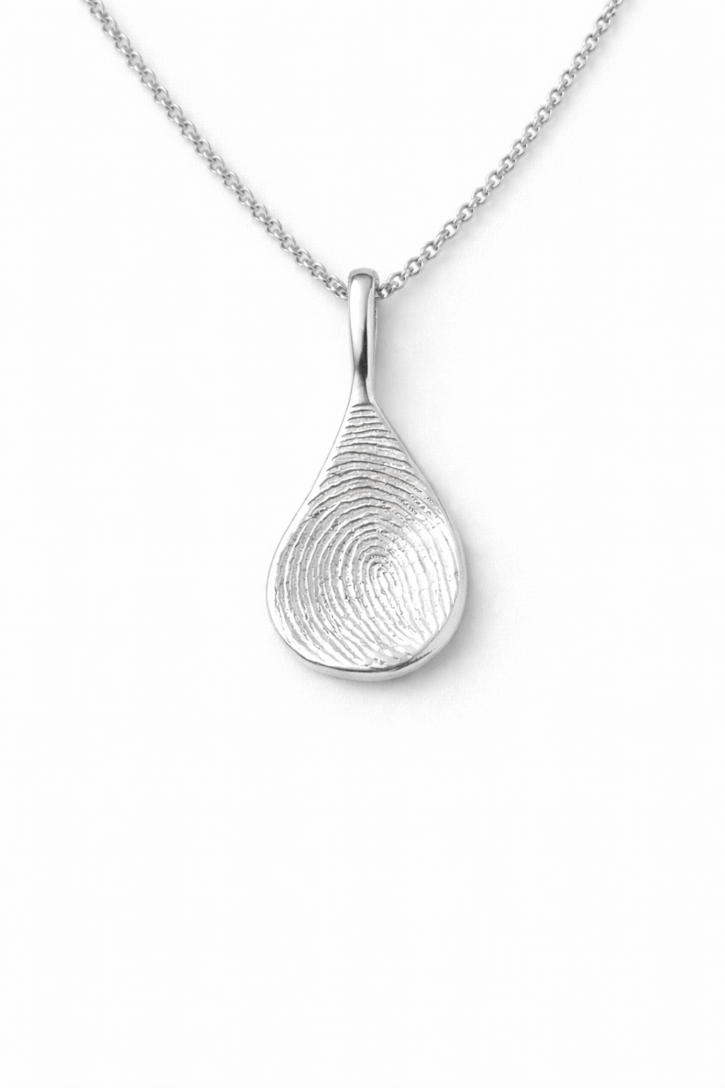 A teardrop-shaped pendant engraved with your child’s real fingerprint, crafted from genuine 925 sterling silver.